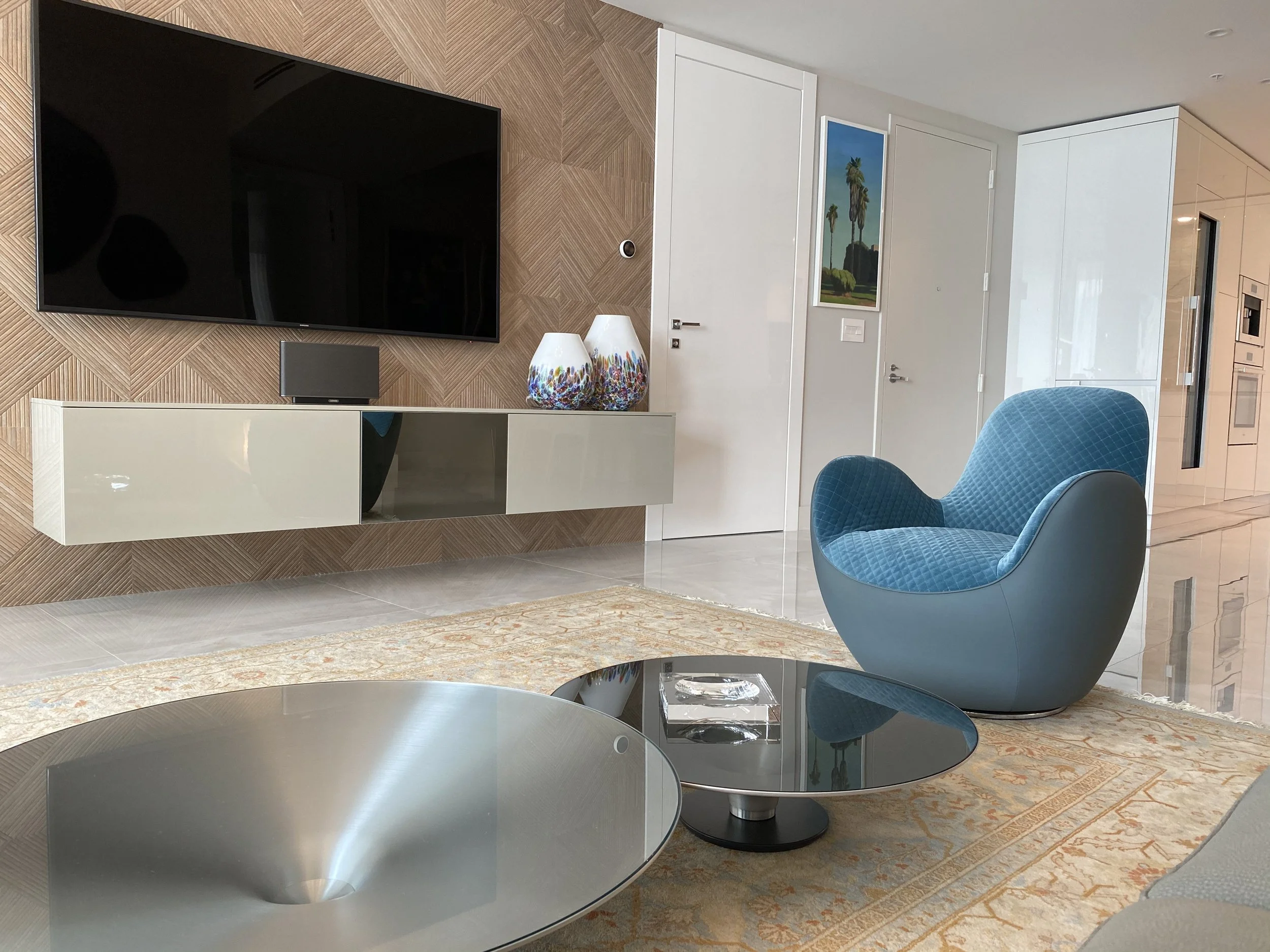 The living room features a striking natural wood wall as a focal point, adding warmth and texture. A palette of sandy beiges and ocean blues creates a serene coastal ambiance, allowing the wood to shine while blending with the decor. Earthy accents like woven textiles and stone elements enhance its natural feel. Strategic lighting highlights the wood grain, contributing to the room’s sophistication. Plush muted furnishings invite relaxation, complemented by ocean-themed artwork and a large white chandelier that matches the kitchen fixture. A sandy and blue area rug covers the elegant calacata marble floor, making this living room a perfect haven for rest and reflection.